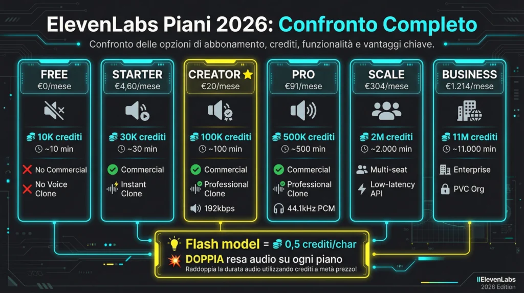 > 💡 **La regola del Banco di Prova:** Se generi più di 15 minuti audio al mese, il piano Creator a €20 batte qualsiasi alternativa umana sul rapporto costo-qualità-velocità. Sotto i 15 minuti, lo Starter a €4,60 è sufficiente. Non esiste una zona grigia.