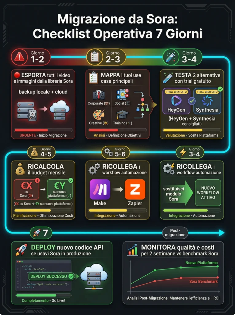**Giorno 5-6:** Se avevi automazioni Make o Zapier collegate a Sora, sostituisci il modulo. HeyGen e Synthesia hanno entrambi integrazioni native con Make.