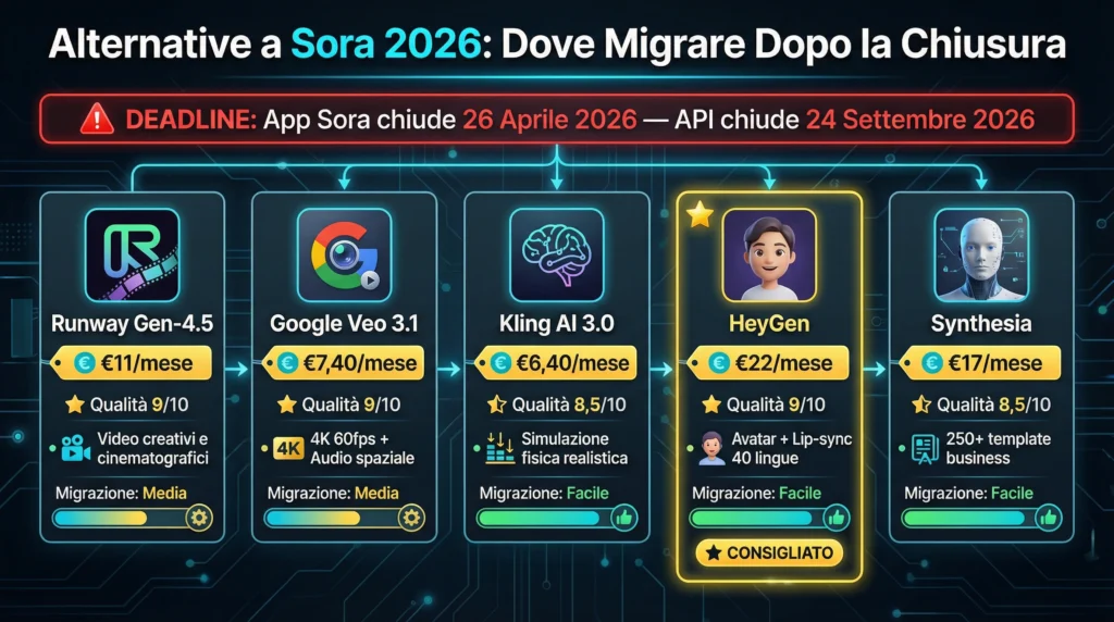 **Se usavi Sora manualmente per creare contenuti** — video social, prototipi, concept — la migrazione è più semplice. Si tratta di trovare un tool alternativo, imparare l’interfaccia, e ricalibrare le aspettative sulla qualità e i tempi.
